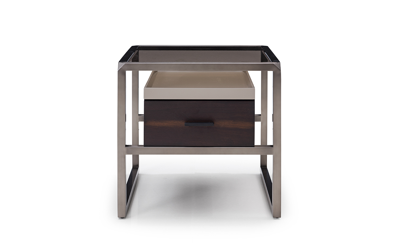 Современная прикроватная тумбочка, в которой геометрия форм и текстуры материалов создают выразительный интерьерный акцент. Комбинация тёплого дерева, стеклянной столешницы и металлического каркаса придаёт ей брутальную элегантность и утончённость. Эта тумбочка станет не просто функциональной частью спальни, а стильным элементом обстановки в духе минимализма, лофта или неоклассики. Идеальна для хранения мелочей и создания завершённого образа интерьера.