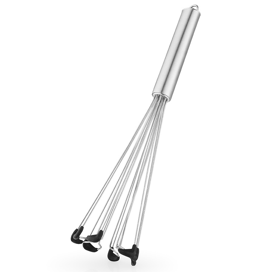 Венчик со специальными силиконовыми наконечниками поможет добиться идеальной консистенции соуса без комочков.Венчик выполнен из качественной нержавеющей стали. Особая конструкция препятствует скоплению ингредиентов внутри венчика. Силиконовые наконечники защищают емкость от царапин, обеспечивают устойчивость и позволяют устранять комки на дне. Изделие оборудовано практичным крючком для подвешивания.
