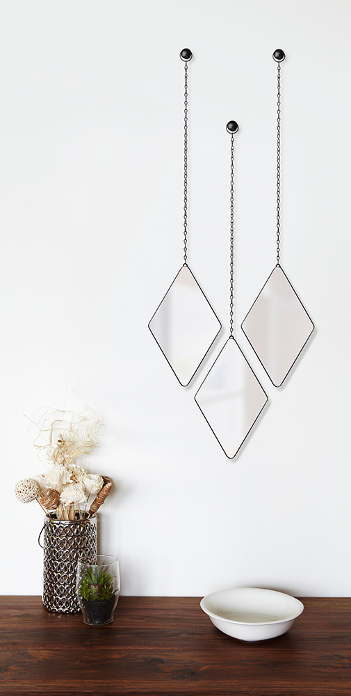 Если картины, полки или фоторамки не подходят в интерьер стены, на помощь придут зеркала. Набор из трёх оправленных в металл зеркал - стильное украшение интерьера. Такие зеркала выглядят как драгоценные камни на подвесках. Можно располагать в любом сочетании и на любом расстоянии. В комплект входят декоративные металлические каркасные крючки.