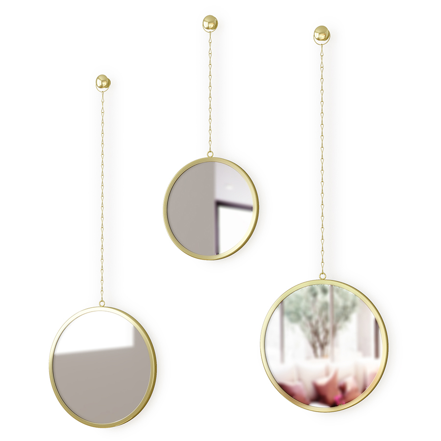 Пополнение в коллекции Dima – комплект из трех круглых зеркал в цвете латуни. Зеркала в металлических рамах с подвесом на металлических цепочках. Крепятся к стене при помощи шурупов и дюбелей, которые закрываются декоративными металлическими заглушками. Крепления входят в комплект.
