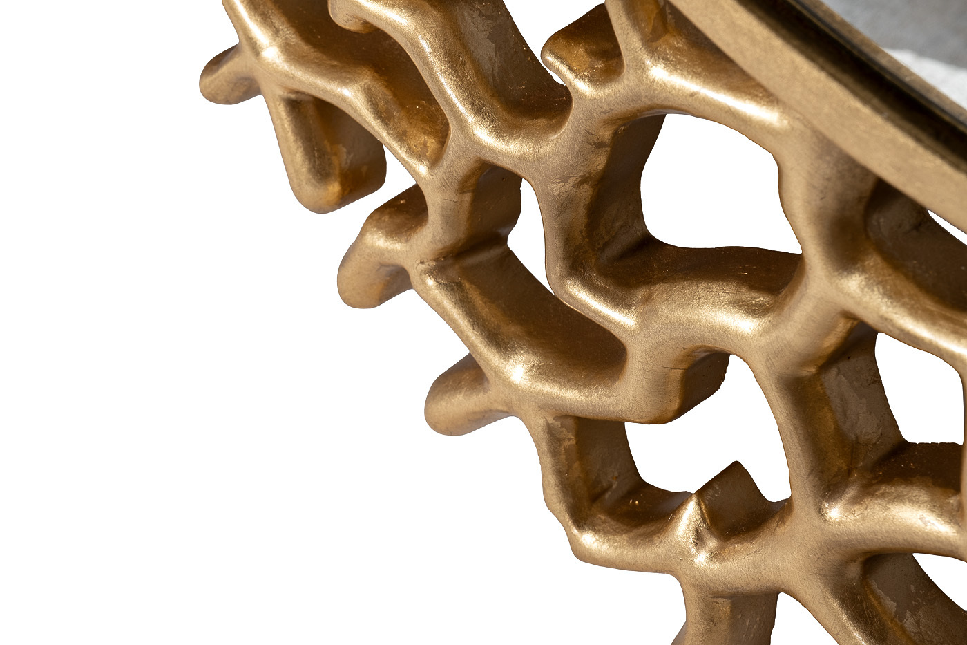 Декоративное настенное зеркало с ажурной круглой рамой — это стильное и современное решение для оформления пространства. Изделие прекрасно дополнит гостиную, холл, спальню или прихожую. Дизайнерское зеркало станет авторской изюминкой и ярким акцентом интерьера. Рама, визуально напоминающая сплетение кораллов или тонких ветвей, выполнена из золотистого металла. Ажурное плетение придает зеркалу очарование и шик. Аксессуар можно использовать как отдельный элемент декора, так и в сочетании с комодом, консолью или оформлением бра.