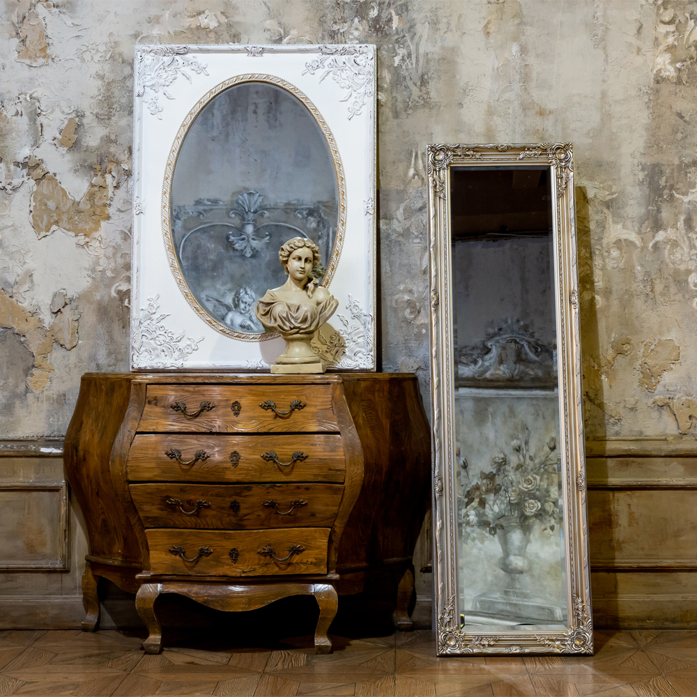 Белый цвет рамы сдержанный, матовый, с лёгкой патиной темного цвета по краям и декоративным элементам. Внутренняя овальная рама зеркала патинирована сдержанным золотым.