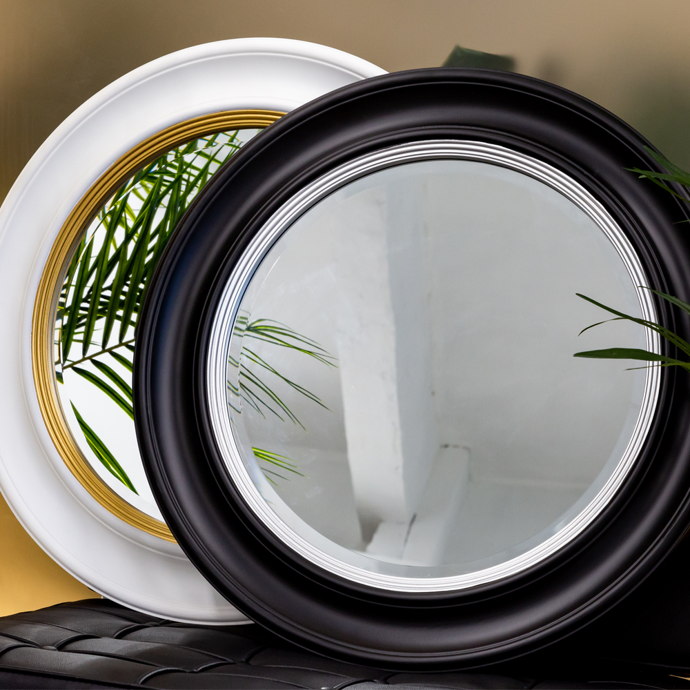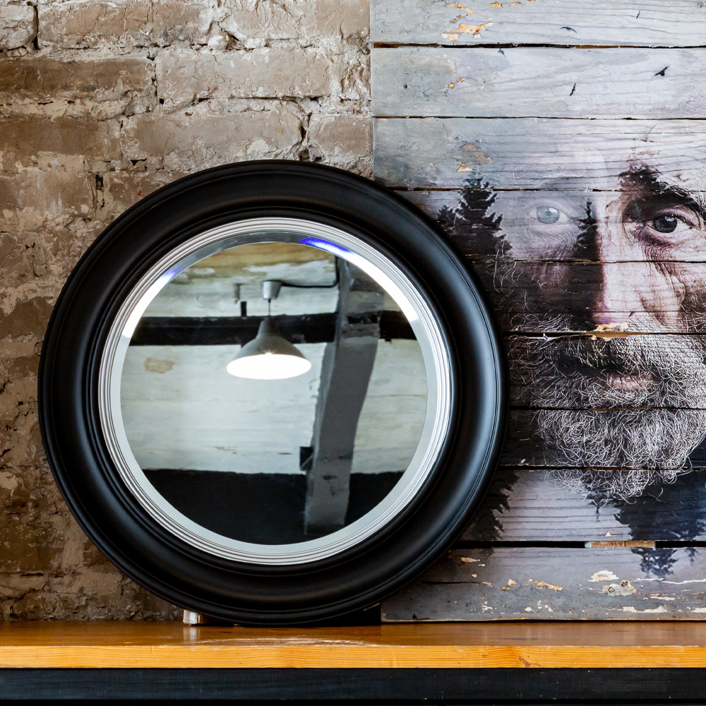 У этого предмета оптимальный размер зеркального полотна – 45,5 сантиметров. Рама шириной 10 сантиметров в матовом черном изложении внутри украшена серебряным кантом, опоясывающим само зеркало, имеющее фацет. На багетной раме несколько граней, что придает необходимый объём и фактурность зеркальному предмету. Идеальный вариант для утонченных интерьеров!