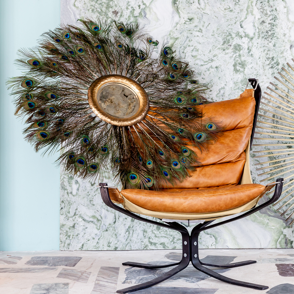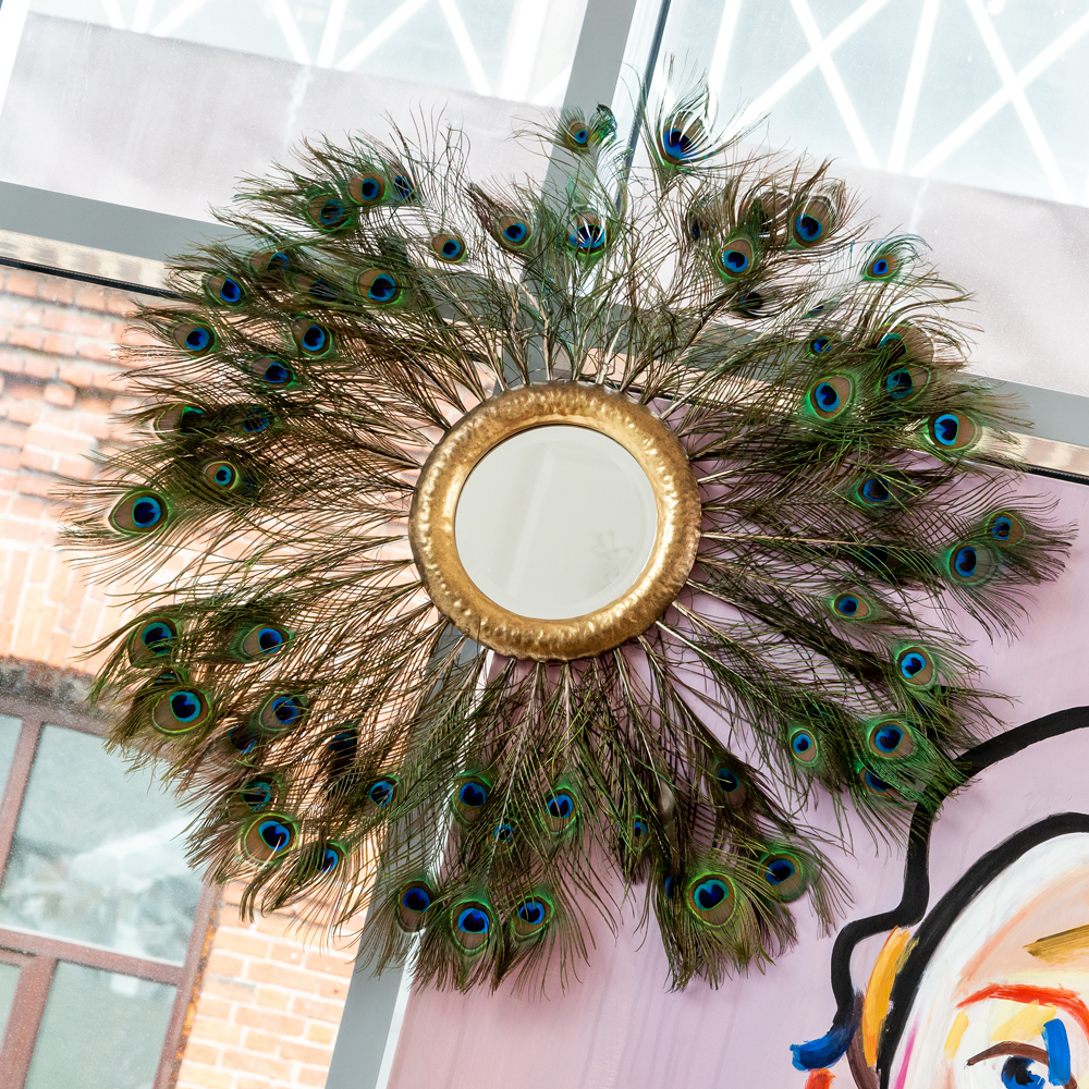 После сезонного помешательства на леопардовом орнаменте переходим на перья жар-птицы, – совсем не хищник, но точно модный фасон! Поймать за хвост птицу счастья мечтает каждый. Тем более что такой шанс выпадает не так часто и не каждому, – того и гляди улетит в другие интерьеры... Камея - не просто красивое название, - оно означает породу индокитайского зеленого павлина, раскрасившего наш интерьер своими фантастически великолепными хвостовыми перьями. Экзотичное и поистине оригинальное зеркало бесспорно станет для Вас главным интерьерным украшением. Обратите внимание на идеальное сочетание павлиньего наряда с золотой окружностью рамы, подсвеченной широкой фацетной гранью. Металлическая окружность рамы обработана редким в наши дни ремеслом чеканки, задающим дизайну теплое обаяние старины. Культ павлинов распространяется от древних китайских легенд, связывающих птицу с успехом и процветанием, мудростью и защитой, до английского средневековья, провозгласившего павлина королевской птицей и раскрасившего его оперением придворную одежду и дворцовую роскошь. Как бы то ни было, естественная природная красота и благородство - бесспорный рецепт и для наших интерьеров.