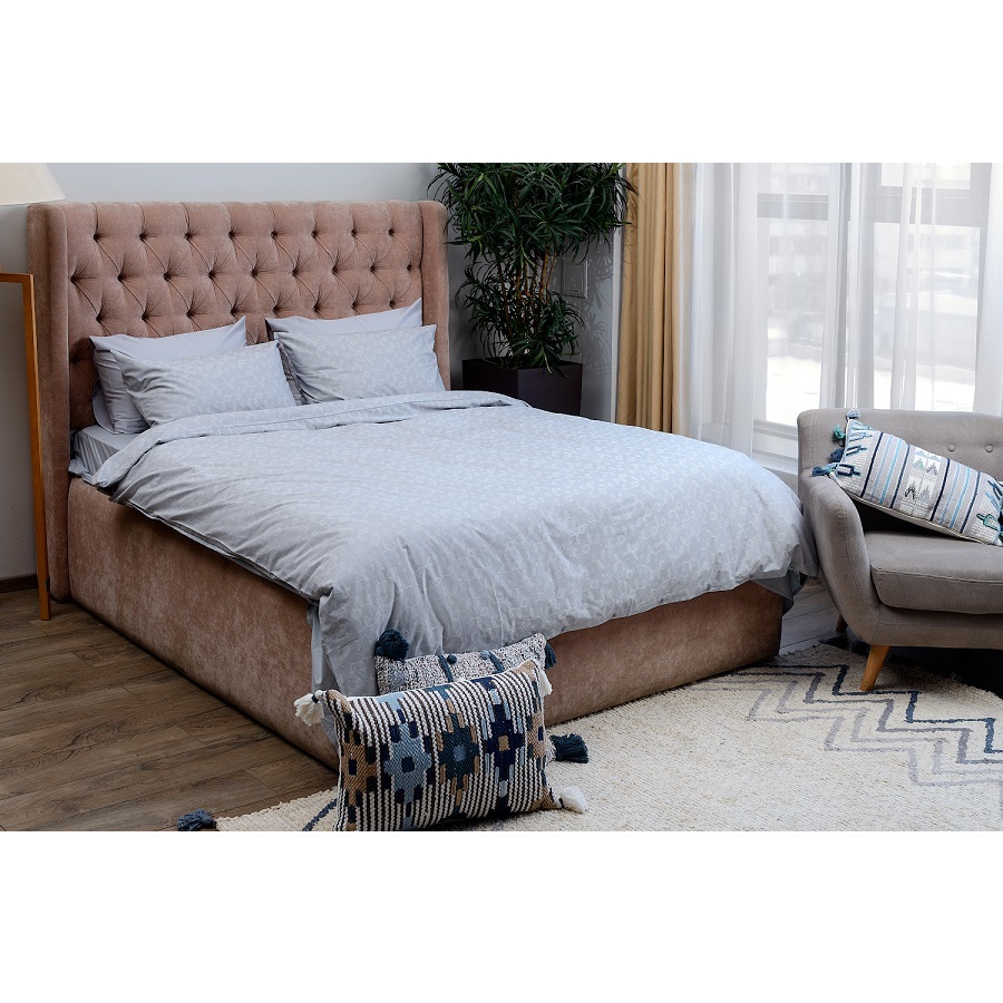 Контрастный узор с мотивами русского севера добавит ноту национального колорита в спальную комнату. Материал отличается особым способом пряжи: нити переплетаются в скрученном виде, что придает ткани дополнительную прочность. Еще одна особенность жаккарда – гладкий, приятный на ощупь текстиль, с которым не захочется расставаться после крепкого сна.